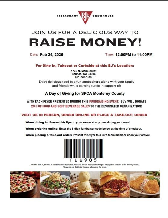 Enjoy a meal with family and friends and support our mission at the same time. During this special fundraising event, BJ’s will donate 20% of food and soft beverage sales to support our organization when you present the flyer.