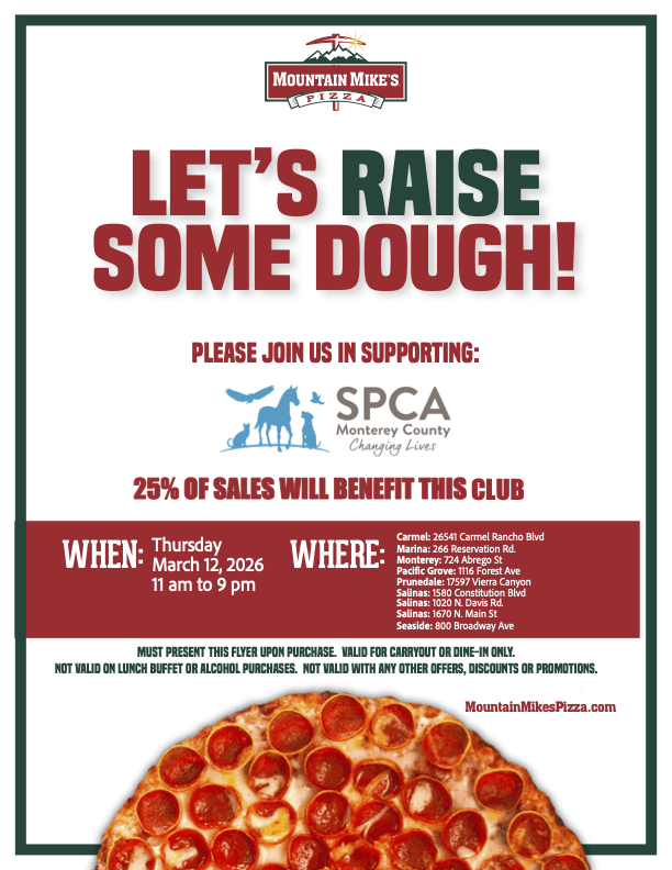 Join us at Mountain Mike’s Pizza on Thursday, March 12th from 11am to 9pm and turn your lunch or dinner plans into lifesaving support for SPCA Monterey County.